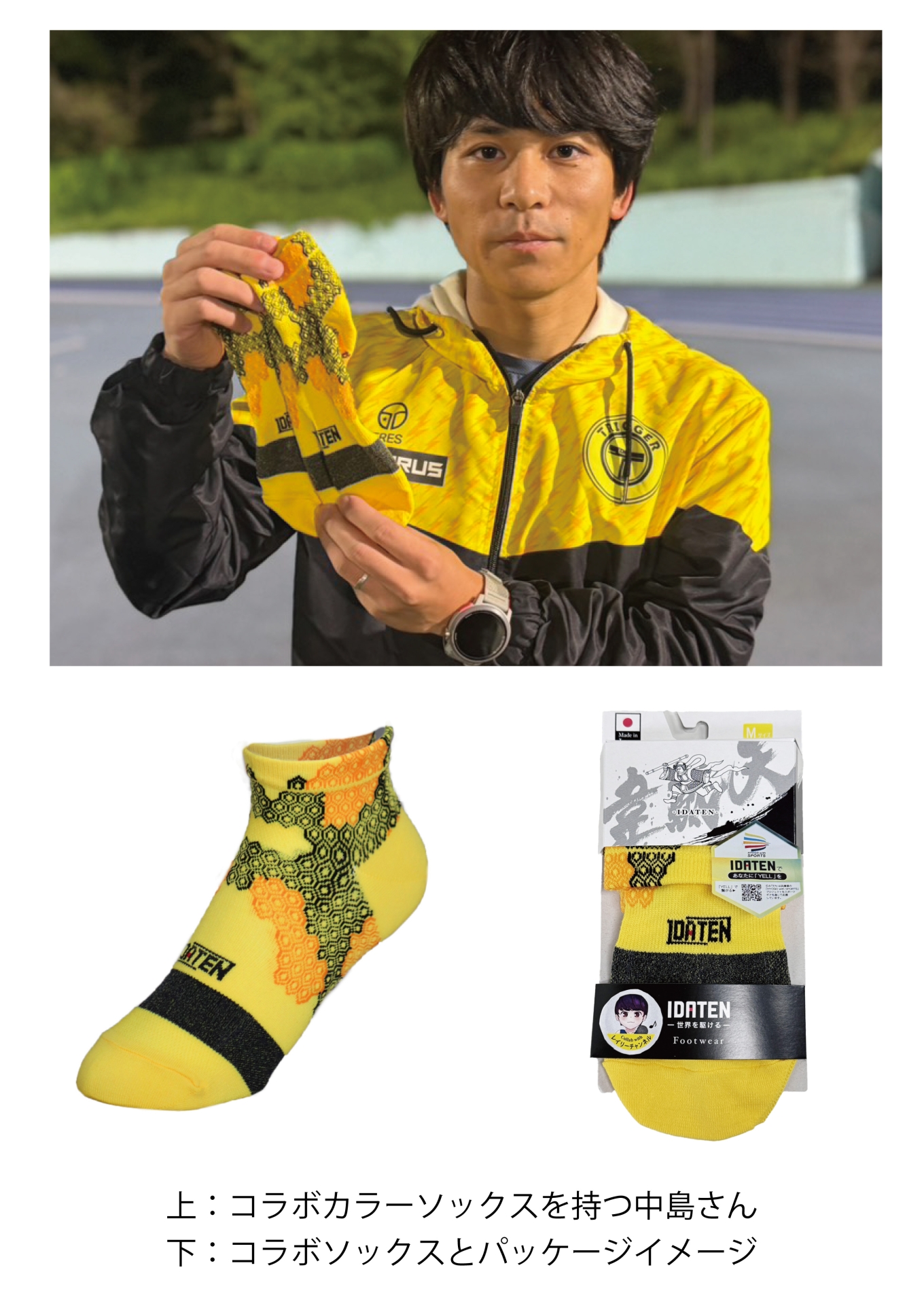 コラボカラーソックスは、定番のIDATENハニカムテーピングソックスをベースに中島さんが運営する陸上クラブ「TRIGGER AC」のイメージカラーを取り入れました。